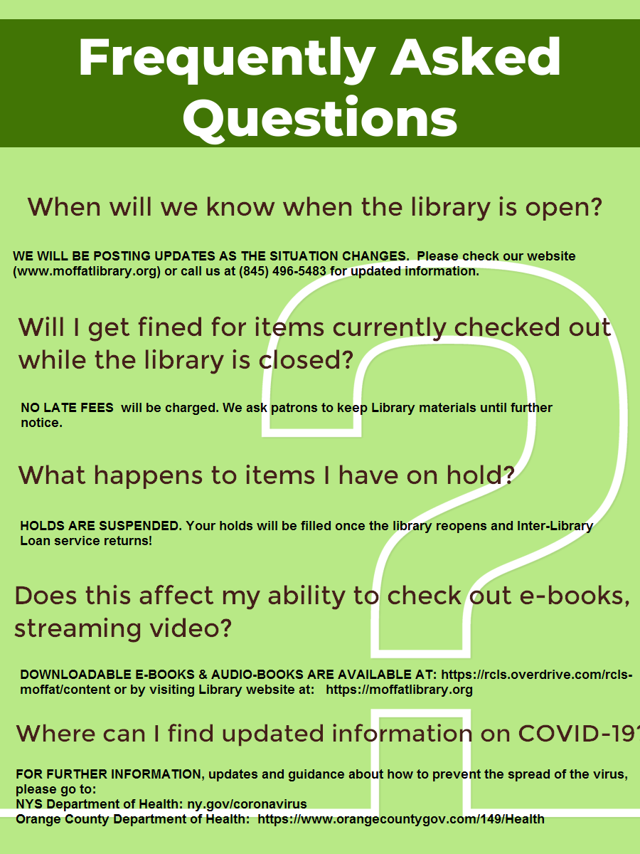 In addition, please feel free to leave a message on the Library’s voicemail (845) 496-5483 x 0 or email us at: moffat@rcls.org. We will be checking messages on a daily basis and will make every effort to assist virtually.